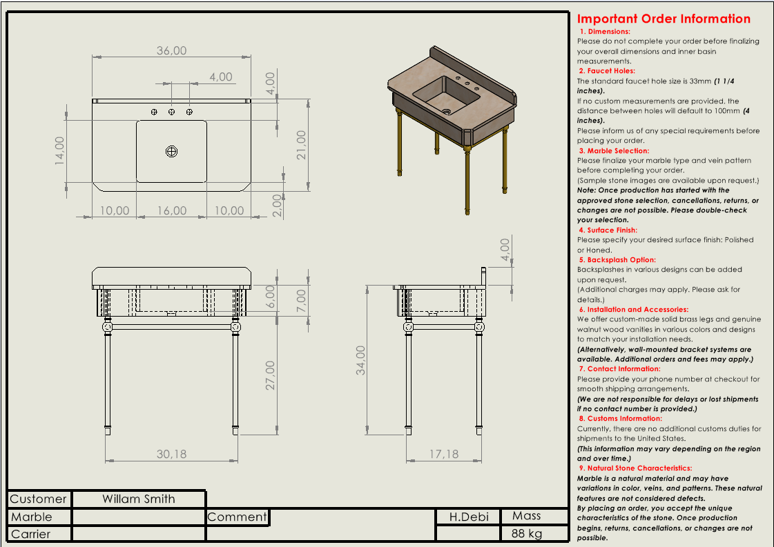 The 36" wide Picasso Marble sink, with Silver/Chrome Legs